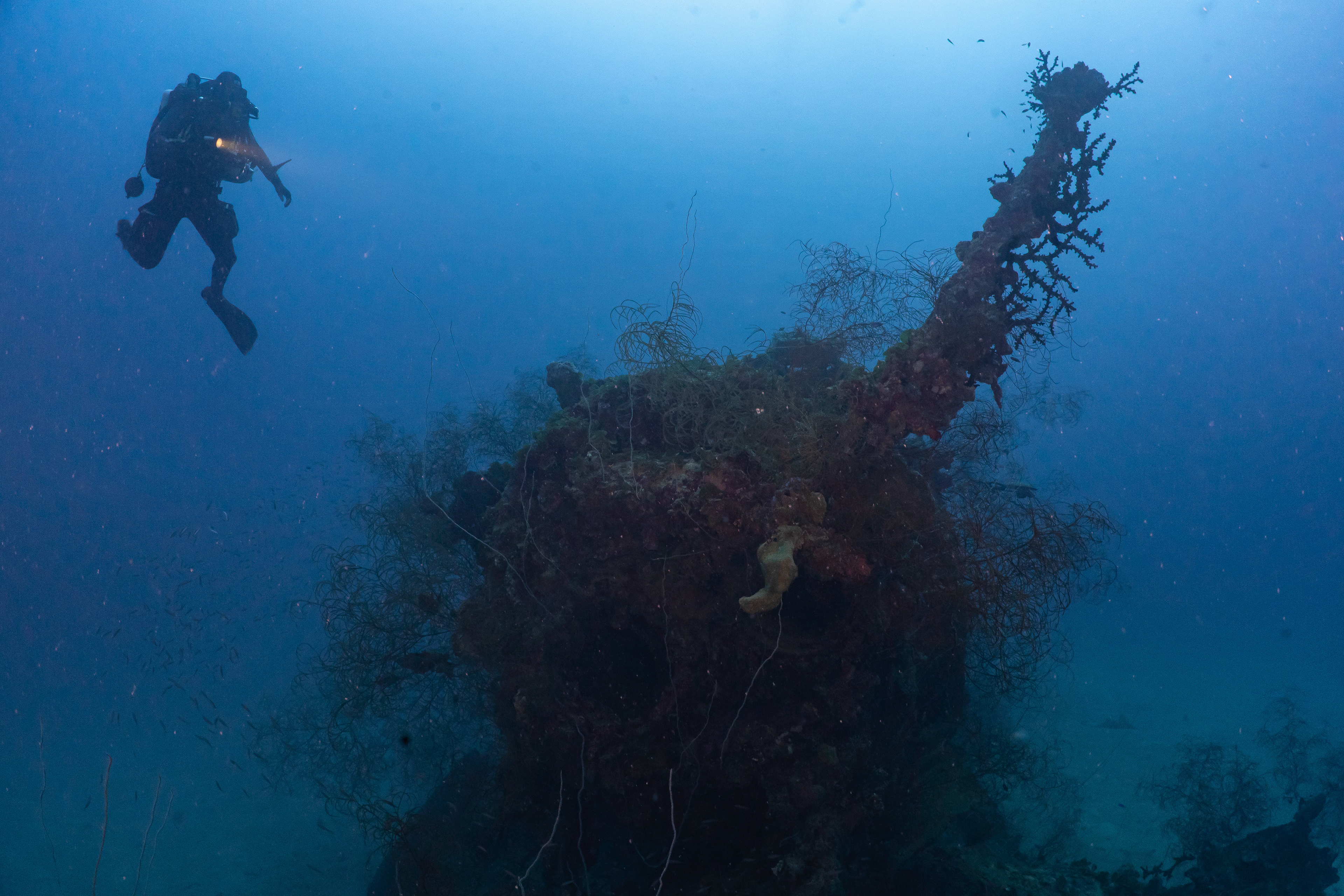 The I-169 was a large submarine that had been part of the Pearl Harbor strike, and continued missions through the war, and as a larger sub, it served as a supply vessel as the US shut down the Japanese merchant forces. The I-169 was not lost during Operation Hailstone, but rather by accident when a hatch was left open when the sub was diving to avoid an inbound airstrike two month after Hailstone. Stuck on the bottom, multiple efforts were taken to raise the sub but eventually, trapped crew perished. Later, the IJN depth charged the sub to keep secrets from falling into American hands, thus the breakup of the sub. Mid-ships sits in about 112' of water at the sand, sloping down to 144' at the stern.